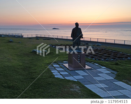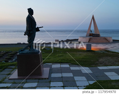 宗谷岬の間宮林蔵の立像の夕焼けの空撮