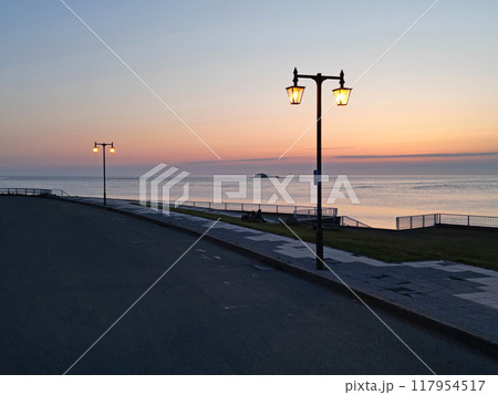 夕暮れの誰もいない宗谷岬海岸の空撮