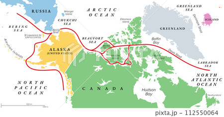 Northwest Passage, NWP, political map. Sea lane between Atlantic and Pacific Ocean through the Arctic Ocean, along the coast of North America via waterways through the Arctic Archipelago of Canada.