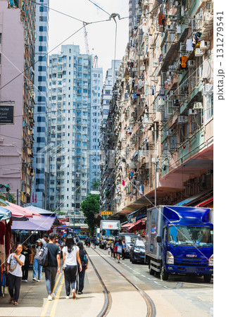 香港・クアリーベイのモンスターマンションの前を走るトラム。英国植民地時代から走る