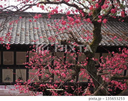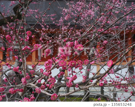 早春の京都 北野天満宮 紅梅と本殿・透塀