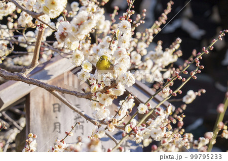 早春の北野天満宮 三光門 綺麗に咲いた白梅とメジロ(京都市上京区馬喰町)