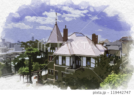 水彩画風 神戸 東遊園地 ヴィラブランシュ 兵庫県神戸市