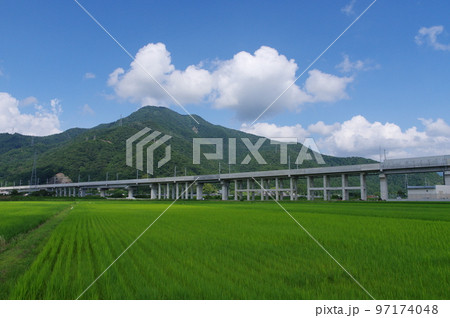 建設中の北陸新幹線 越前たけふ駅と日野山 福井県越前市 2022年5月