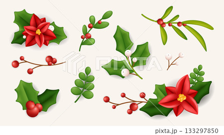 Christmas holly berry 3d elements set in realistic render design. Collection of glossy red flowers with green leaves, twigs with berries, festive flourish decoration composition. Vector illustration.
