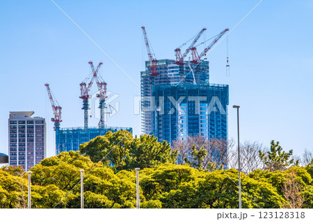 日本の東京都市景観 建設中の豊海地区・タワーマンションなどを望む=19日