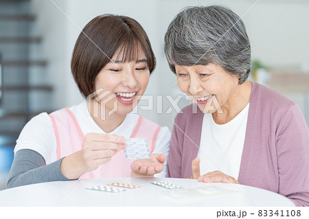 訪問診療 介護士さんに薬の説明をしてもらう高齢の女性