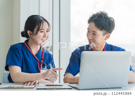 医療のカンファレンス・勉強会・セミナー・研修・講習会を受けるスクラブ姿の医療スタッフ