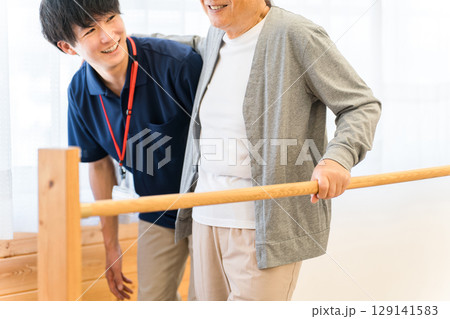手すりを使い歩行訓練するシニア男性と介助する作業療法士,理学療法士の男性スタッフ