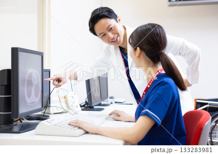 モニターでCTスキャンの検査結果を見る放射線技師 撮影協力:学校法人電波学園 東京電子専門学校