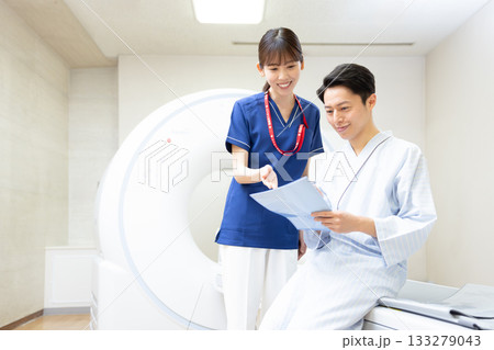 CTスキャンを受ける男性と放射線技師 撮影協力:学校法人電波学園 東京電子専門学校