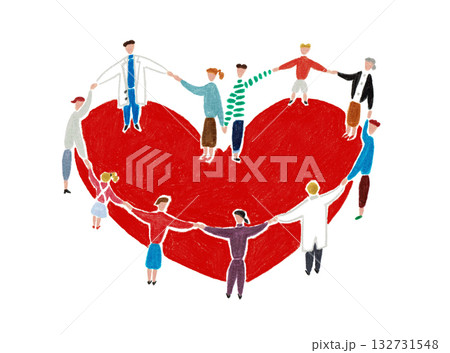 手描きイラスト ハートの輪になって手をつなぐ患者と医者
