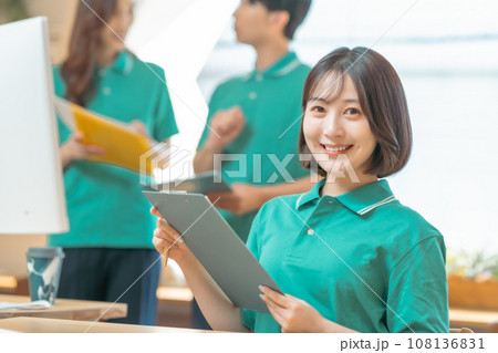 ポロシャツのユニフォームで働くオフィス勤務の若い女性