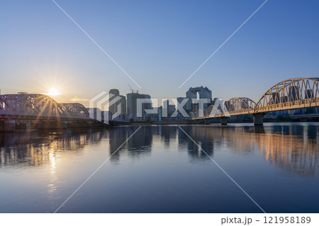 淀川を挟んで見る大阪梅田の高層ビル群と朝日