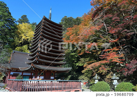 談山神社 紅葉に包まれる十三重塔と神廟拝所 横位置
