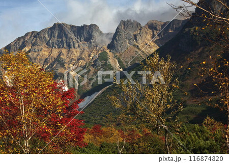 紅葉の中を十勝岳へゆく道道291号吹上上富良野線 ( 北海道 上富良野町 )