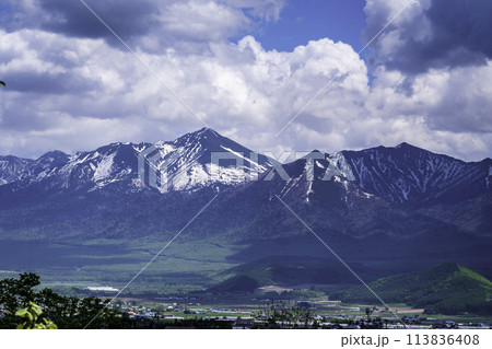 春の丘陵地帯と雪山の山頂 十勝岳