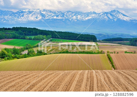 北海道上富良野町 丘陵地帯の畑と十勝岳連峰の雄大な風景