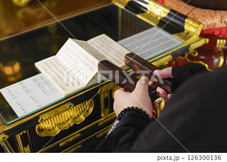 お寺の本堂で読経をするお坊さん
