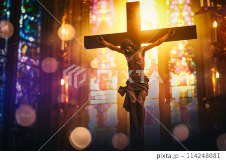 Crucifix with Jesus Christ on cross in church with light coming through stained glass windows - symbol of christian faith religion