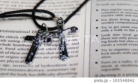 Shiny metal cross with black sling on old book to recall the kindness of Jesus Christ for all of Christian