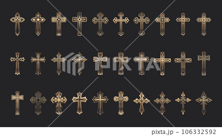 Flat Vector Golden Christian Cross Icons Set. Line Silhouette Cut Out Christian Crosses Collection
