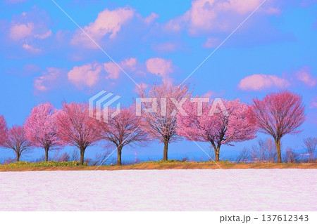 早春の青空に映える津南町沖ノ原台地の雪上桜