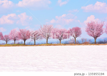 早春残雪の新潟県十日町市津南町沖ノ原台地に咲く雪上桜