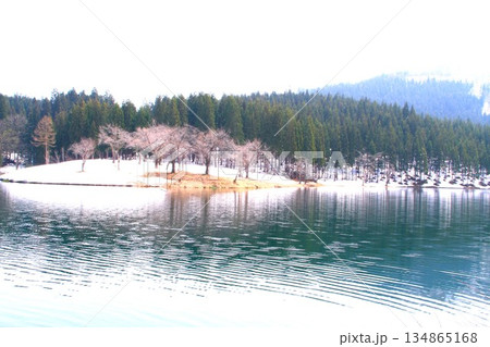 残雪の中子の池桜風景
