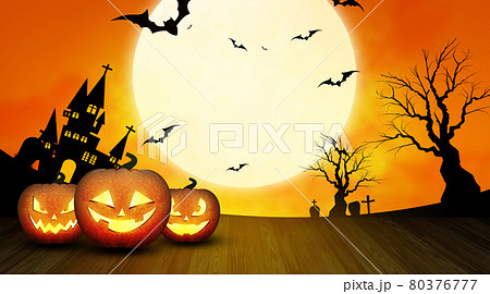 ハロウィン 満月の夜に浮かぶかぼちゃと墓地のシルエット