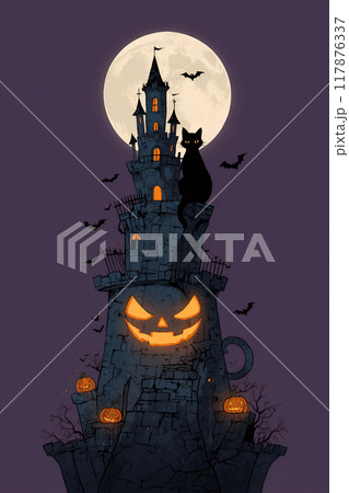 ハロウィンのカボチャと満月と城のイラスト AI画像