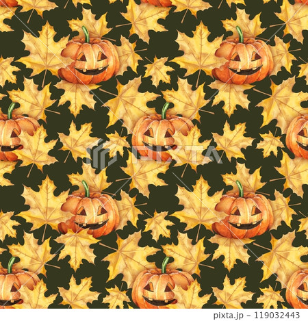 Watercolor seamless pattern with Halloween pumpkins and autumn maple leaves. Great for your fabric design, wrapping paper, holiday party, festive textile, wallpaper