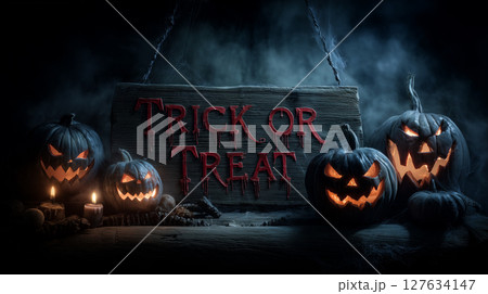 夜に光る恐怖のかぼちゃと赤い滴る文字の木製看板 | ダークホラー