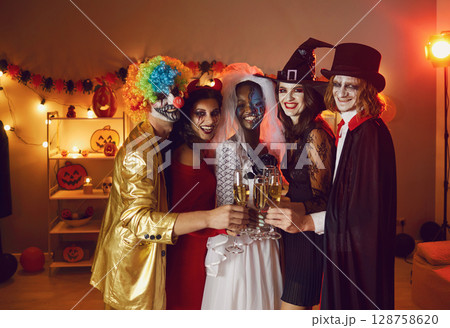 Diverse group of happy young men and women clinking glasses at a Halloween party