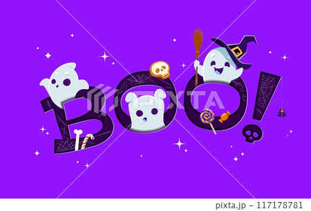 Halloween paper cut boo banner with kawaii ghost characters and holiday sweets. Cartoon funny flying ghosts and spirits vector personages with witch hat and broom, 3d papercut boo, candies and cookies