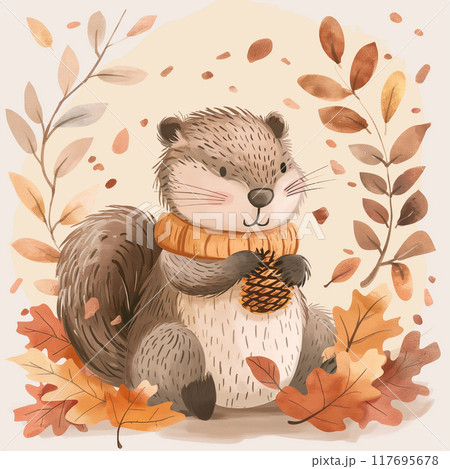 Autumn illustration with cute beaver and cozy objects, autumn leaves in soft pastel colors.