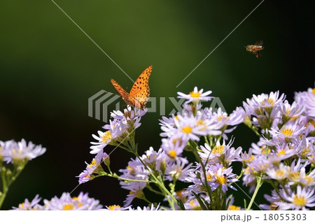 満開のシオンと蝶々とミツバチ