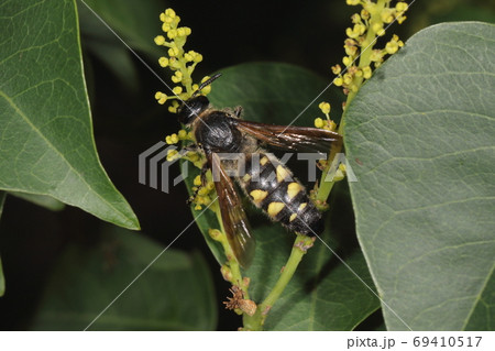 生き物 昆虫 コモンツチバチ、コガネムシの天敵の大人しいハチ。成虫がナンキンハゼの花で食事中