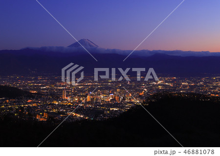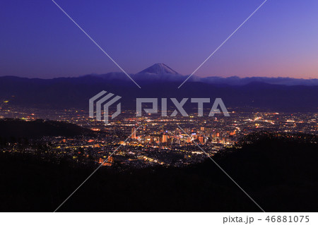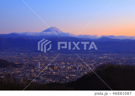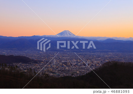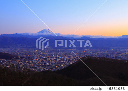 山梨県/ 紅富士と夕日に染まる甲府の街 夕景