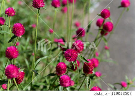 遊歩道に咲き乱れる美しいセンニチコウ(千日紅)の花「くじゅう花公園」大分県竹田市