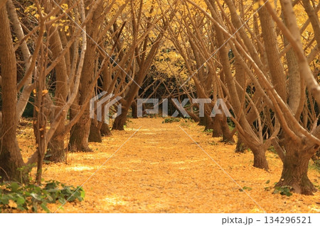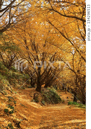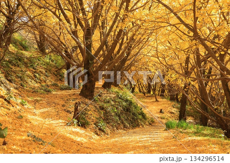一面に広がるイチョウの落葉と二手に分かれる道(日本 鹿児島県垂水市)