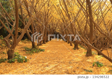 黄色の絨毯が一面に広がるイチョウ並木(日本 鹿児島県垂水市)