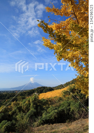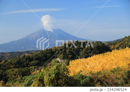 鮮やかな黄色の千本イチョウと噴煙が上がる桜島(日本 鹿児島県垂水市)