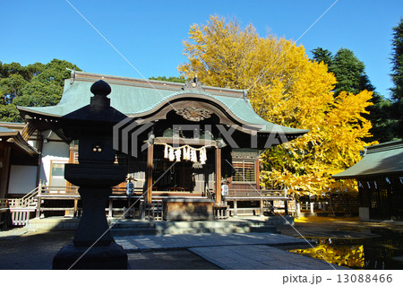 東京都の神社、杵築大社の千年イチョウと鳥居と狛犬です。