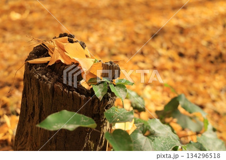 朽ち木に積るイチョウの落葉(日本 鹿児島県垂水市)