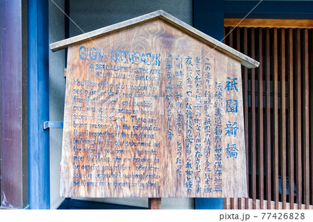 雨の京都、祇園新橋(重要伝統的建造物保存地区の案内板)界隈