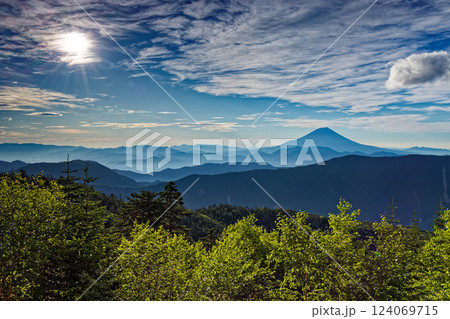南アルプス・千枚小屋から見る夕方の富士山と反薄明光線