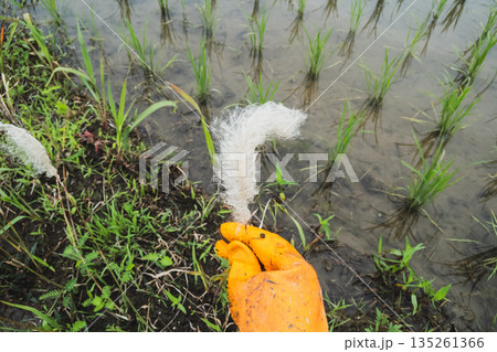 風になびくチガヤの白い穂 田植え時のあぜ道