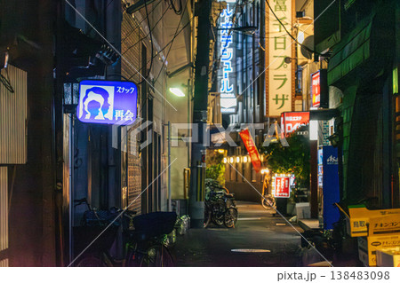 充滿復古氛圍的日本大阪巷弄夜景與閃爍的日式小酒館霓虹招牌