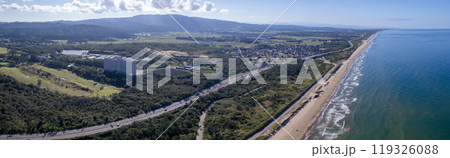 ドローン|千里浜なぎさドライブウェイへ続く千里浜IC付近|のと里山海道|南方を撮影|石川県羽咋市